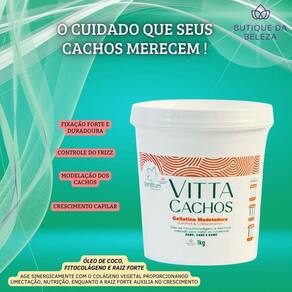 Gellatina modeladora vitta cachos clorofitum Creme capilar modelador clorofitum, indicado para todos os tipos de cabelos, especialmente cabelos cacheados, ondulados e crespos. A gellatina vitta cachos, possibilita uma fixação forte e duradoura, além de modelagem e proteção. Os ativos tais como óleo de coco e raiz forte em sua fórmula rica em colágeno vegetal, ajudam a ordenar as cutículas e reduzir o frizz indesejado, além de auxiliar no crescimento.