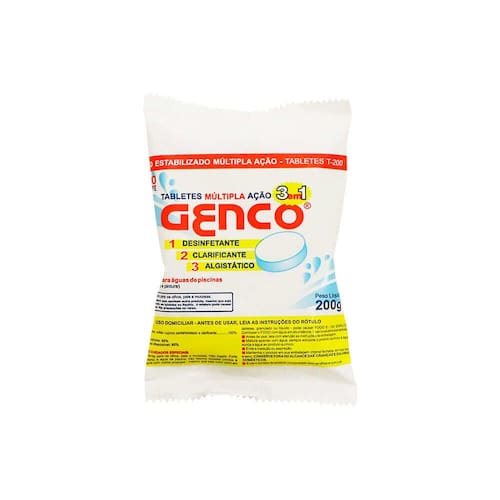 Produto concentrado, contém 85% de cloro ativo. Possui estabilizante que inibe a degradação do cloro pelos raios UV (raios solares). GENCO® TABLETES MÚLTIPLA AÇÃO "3 em 1" apresenta dissolução lenta para cloração contínua e automática. Sua fórmula múltipla ação é recomendada especialmente para quem quer praticidade aliada à qualidade. Poderoso desinfetante (cloro com estabilizante), clarificante, algicida e algistático. Indicado para piscinas residenciais.