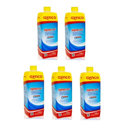 Especificações técnicas: - Marca: Genco - Modelo: Kit 5 Genfloc - Tipo: Clarificante floculante e decantador - Indicação: Águas de piscinas - Ação: Atrai partículas de sujeira e forma flóculos grandes que podem ser retidos pelo filtro - Dosagem recomendada: De 3 a 6 ml para cada 1000 litros de água alta turbidez / 1,5 ml para cada 1000 litros de água manutenção - Utilização: Dosagem única ou programa de dosagem semanal regular - Compatibilidade: Todos os tipos de piscinas fibra, vinil ou alvenaria - Incluso: 1 Genfloc clarificante - Genco Ean: 7898661622234