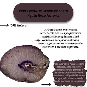 Geodo de Pedra Ágata Roxa Natural Decoração Geodo de Pedra Ágata Roxa Natural Decoração Transforme seu ambiente com a beleza e a energia única do Geodo de Pedra Ágata Roxa Natural. Esta peça fascinante não é apenas uma decoração sofisticada, mas também uma verdadeira fonte de equilíbrio e serenidade. Com suas camadas de cores roxas intensas e padrões intrincados, cada geodo é uma obra-prima da natureza, proporcionando um toque de luxo e energia positiva para qualquer cômodo da sua casa. Benefícios: A Ágata Roxa é amplamente reconhecida por suas propriedades espirituais e terapêuticas. Ela é conhecida por ajudar a aliviar o , promover a clareza mental e aumentar a conexão espiritual. Ideal para quem busca maior equilíbrio emocional e bem-estar, ela também favorece a cura interior, ampliando a intuição e estimulando a meditação profunda. Sua energia e protetora torna o Geodo de Ágata Roxa a escolha perfeita para espaços de relaxamento, como salas de estar, escritórios ou áreas de meditação. Além de suas propriedades curativas, este geodo traz uma beleza natural impressionante, que adiciona um toque de elegância ao seu ambiente. Sua presença se destaca, criando uma atmosfera acolhedora e inspiradora. Enviamos a sua encomenda em até 24 horas após a confirmação do pagamento Caso tenha alguma dúvida nos mande mensagem que responderemos rapidinho para te ajudar da melhor forma possível Marca: Não Informado