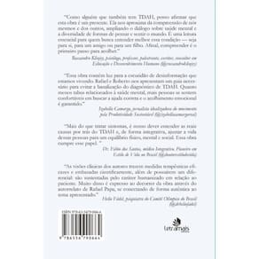 “Como alguém que também tem TDAH, posso afirmar que esta obra é um presente. Ela nos aproxima da compreensão de nós mesmos e dos outros, ampliando o diálogo sobre saúde mental e a diversidade de formas de pensar e sentir o mundo. É uma leitura essencial para quem busca entender melhor essa condição — seja para si, para um amigo ou para um filho. Afinal, compreender é o primeiro passo para acolher.” Rossandro Klinjey, psicólogo, professor, palestrante, escritor, consultor em Educação e Desenvolvimento Humano (@rossandroklinjey) “Essa obra contém luz para a escuridão de desinformação que estamos vivendo. Rafael e Roberto nos apresentam um guia necessário para evitar a banalização do diagnóstico de TDAH. Quanto menos tabus relacionados à saúde mental, mais pessoas se sentem confortáveis em buscar a ajuda correta e o acolhimento emocional é garantido.” Izabella Camargo, jornalista idealizadora do movimento pela Produtividade Sustentável (@izabellacamargoreal) “Mais do que tratar sintomas, é nosso dever entender as reais causas por trás do TDAH e, de forma integrativa, ajustar a vida dessas pessoas para um equilíbrio físico, mental e social. Essa obra cumpre esse papel.” Dr. Fábio dos Santos, médico Integrativo. Pioneiro em Estilo de Vida no Brasil (@doutorestilodevida) “As visões clínicas dos autores trazem medidas terapêuticas eficazes e embasadas cientificamente, além de possuírem um diferencial: são sustentadas pelo caráter humanizado em relação ao paciente. Muito disso é expresso ao decorrer da obra através do autorrelato de Rafael Papa, se conectando de forma autêntica ao tema apresentado.” Hélio Fadel, Presidente do Comitê Olímpico Brasileiro (@drheliofadel)