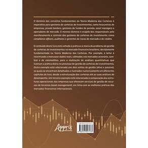 O domínio dos conceitos fundamentais da Teoria Moderna das Carteiras é imperativo para gestores de carteiras de investimentos, como tesoureiros de empresas, private bankers, gestores de fundos de pensão, asset managers e operadores de mercado. O mesmo domínio é exigido dos responsáveis pelo monitoramento e controle dos gestores de carteiras de investimento, como compliance o¬fficers, auditores e gerentes de riscos de mercado e de crédito. O conteúdo deste livro está voltado à prática e à teoria do problema de gestão de carteiras de investimentos no mercado financeiro brasileiro, devidamente fundamentado na Teoria Moderna das Carteiras. Por exemplo, o leitor é incentivado a manusear dados reais, coletados nos mercados acionário, cambial e de commodities, para a realização de análises quantitativas que ilustram a prática diária no processo de gestão de carteiras de investimentos. Outro exemplo está relacionado aos dois estilos de gestão (ativo e passivo), os quais se encontram detalhados e ilustrados numericamente em diferentes capítulos do livro, desde a estruturação das carteiras até as suas análises de desempenho. Um terceiro exemplo está relacionado à comparação das estruturas operacionais das empresas que oferecem serviços de gestão de recursos de terceiros (asset management), em linha com as melhores práticas dos mercados financeiros internacionais.