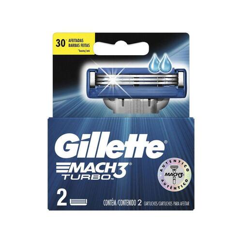 Gillette Shave Care Mach3 Turbo - Cartucho de Barbear 2 refis Cartuchos para barbear Mach3 Turbo da Gillette. Faça um upgrade na sua experiência de barbear Gillette Mach3 Turbo contém lâminas mais afiadas e proporciona um barbear mais rente e suave, sem toda irritação. As lâminas Tubo cortam o pelo com mais facilidade para um conforto superior com menos puxões. Ao mesmo tempo, a fita lubrificante Comfort Gel Bar proporciona um efeito duradouro para um deslizar confortável do aparelho de barbear. Esse aparelho contém 2x mais micro-pentes Skin Guard para um barbear suave. A suspensão das lâminas em molas individuais e independentes facilitam um contato rente com a pele e o pivô de ajuste à pressão se adapta aos contornos para um barbear mais prático e confortável. Mach3 é melhor que um descartável novo, mesmo após 10 barbas feitas. Dura até 2 meses dependendo dos hábitos de barbear e uso pessoal.