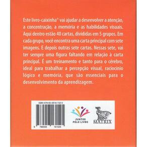 Este livro-caixinha® vai ajudar a desenvolver a atenção, a concentração, a memória e as habilidades visuais. Aqui dentro estão 40 cartas, divididas em 5 grupos. Em cada grupo, você encontra uma carta principal com sete imagens. E depois outras sete cartas. Nessas sete, vai ter sempre uma figura faltando em relação à carta principal. É um treinamento e tanto para o cérebro, ideal para trabalhar a percepção visual, raciocínio lógico e memória, que são essenciais para o desenvolvimento da aprendizagem.