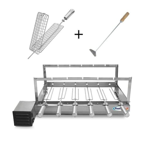 Acompanha 06 Espetos Tridente, 01 Espeto Grelha, 01 Espalhador Carvão e manual de montagem