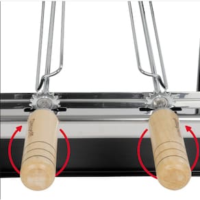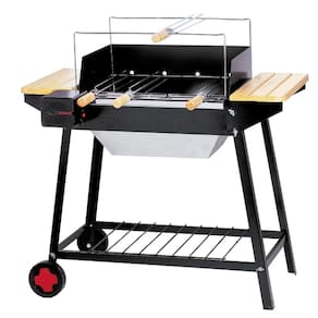 A Giragrill Garden GG-100, conta com 4 espetos giratórios acionados por motor elétrico bivolt, cabos de madeira marfim, acabamento em aço com pintura eletrostática, peças cromadas e calha em inox, 2 mesas de serviço fixas, semi-portátil (desmontável para transporte).