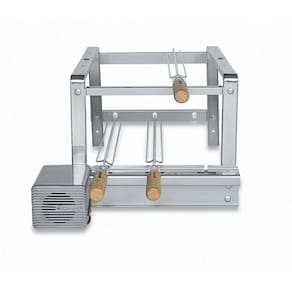 São suportes em AÇO INOXIDÁVEL para churrasqueiras de alvenaria, com 3 espetos que giram em rotação constante, acionados por motor elétrico bivolt.