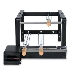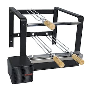 Suporte para churrasqueiras de alvenaria, com 3 espetos que giram em rotação constante, acionados por motor elétrico bivolt. Detalhes exclusivos com registro de patentes: