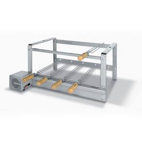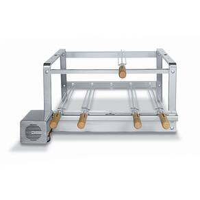 São suportes em AÇO INOXIDÁVEL para churrasqueiras de alvenaria, com 5 espetos que giram em rotação constante, acionados por motor elétrico bivolt.
