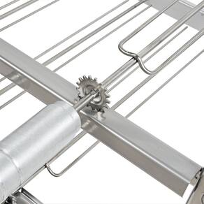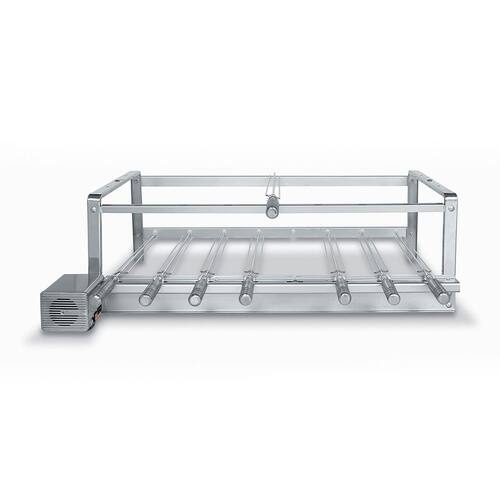 Suportes em AÇO INOXIDÁVEL para churrasqueiras de alvenaria, com 8 espetos que giram em rotação constante, acionados por motor elétrico bivolt. Detalhes exclusivos com registro de patentes: