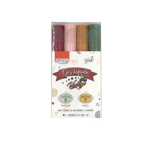 Giz Líquido BRW 6mm Vintage Soul 4g GZ0604 4 cores Giz Líquido ideal para quadro branco, lousa, vidros, plásticos e outras superfícies lisas. Marcador multiuso, com ponta removível que possibilita a escolha entre ponta chanfrada ou redonda.