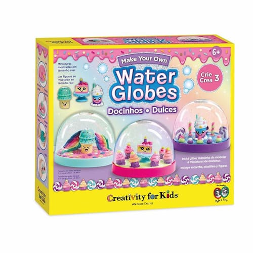 Crie 3 mundos aquáticos temáticos de doces usando as ferramentas de escultura incluídas e argila de modelagem brilhante. Você pode até misturar para criar novas. Complemente seus globos aquáticos com 3 estatuetas doces - um bolo de aniversário, milk-shake e uma casquinha de sorvete. Polvilhe glitter para criar a cobertura de sobremesa perfeita.