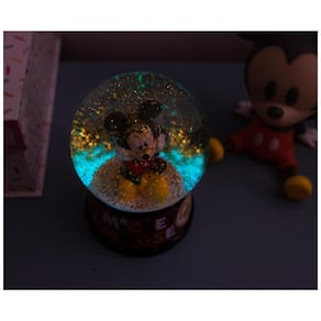Dê um toque mágico ao seu espaço com este globo de neve iluminado que destaca o icônico Mickey Mouse sentado de pernas cruzadas. A base em cerâmica apresenta o nome "Mickey Mouse" e ao acionar o interruptor, o globo emite um brilho colorido e cintilante com glitter que flutua ao redor da figura. Alimentado por baterias (incluídas), é uma peça nostálgica e colecionável que encanta fãs e decora com charme o ambiente, seja na mesa, prateleira ou lareira.