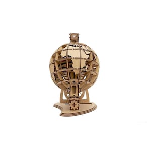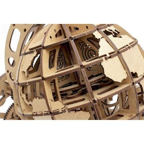 Fabricado através da tecnologia de corte a laser em MDF de 3mm natural, o Globo Mecânico oferece uma experiência única no processo de montagem e assimilação de princípios mecânicos. É um excelente passatempo para toda a família, além de trazer uma experiência interativa de construção de um modelo funcional.