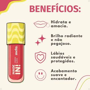 Aplique o Gloss Labial Melu Made In! Ginga Malemolência diretamente nos lábios para um brilho natural e hidratação.