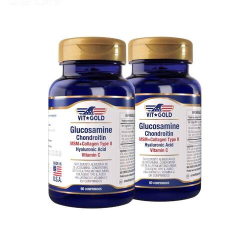 Glucosamina, Condroitina, MSM, Colágeno Vitgold Kit 2x 60 comp Suplemento alimentar de Glucosamina, Condroitina, Metilsulfonilmetano MSM , Colágeno Tipo II, Ácido Hialurônico e Vitamina C em comprimidos.