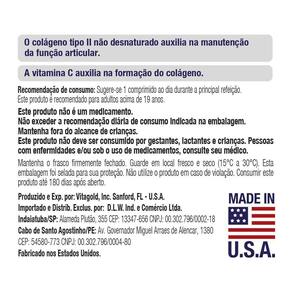 Glucosamina HCI - 750 mg Condroitina - 200 mg Metilsulfonilmetano MSM - 100 mg Colágeno Tipo II - 50 mg Ácido Hialurônico - 5 mg Vitamina C - 30 mg Recomendação de consumo: Sugere-se 1 comprimido ao dia durante a principal refeição.