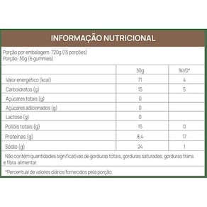 Goalmy gummies protein - chocolate - 90 gomas descrição do produto o gummy que vira músculo. Fácil de transportar. Mais fácil ainda de consumir. fonte de proteínas: auxilia na formação dos Músculos e ossos. contém 12g de proteína wpc. Fonte de proteínas Sem adição de açúcares Não contém glúten Sabor: chocolate Peso líquido: 720g Apresentação: gummy