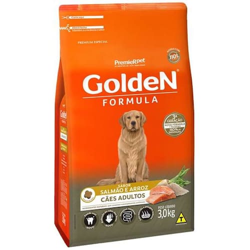 Ração Golden Cães Adultos Raça Média/Grande Salmão e Arroz - 3kg- Saúde oral: auxilia a redução da formação do tártaro;