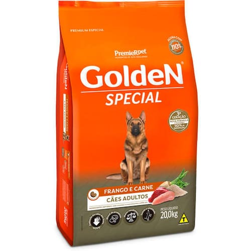 Ração Golden Cães Adultos Special Raça Média/Grande Frango e Arroz - 20kg- Blend de proteínas: máxima satisfação para o paladar; - Maior rendimento: ingredientes de alto aproveitamento; - Saúde e vitalidade: alimento de alta qualidade, rico em vitaminas e minerais; - Redução do odor das fezes: seleção de ingredientes especiais que auxiliam na redução do odor das fezes.