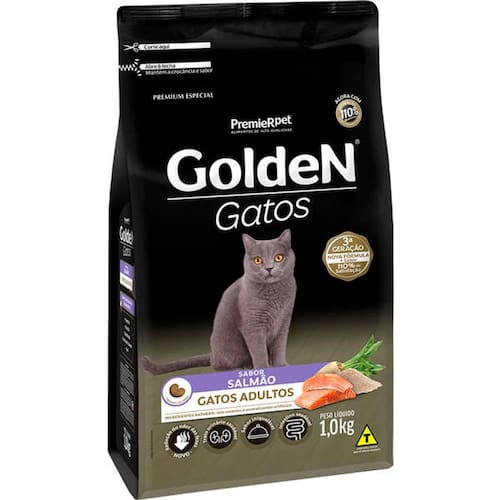 Racao Golden Gatos Adultos Salmao . 1kg. Sabor inigualavel: maxima satisfacao para o paladar;. Trato urinario saudavel: minerais balanceados e controle do pH urinario;. Intestino saudavel: combinacao de ingredientes de alta digestibilidade e prebioticos;. Reducao do odor das fezes: selecao de ingredientes especiais que auxiliam na reducao do odor das fezes.