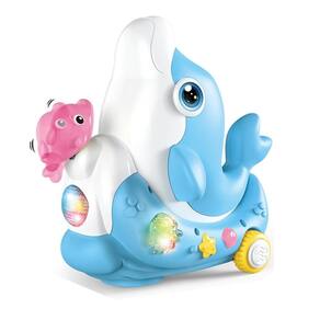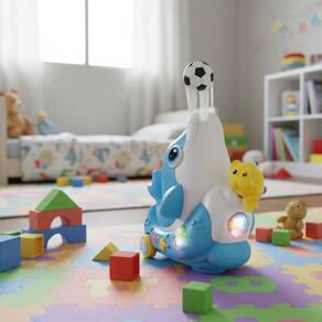 Com um design carismático e cores vibrantes, este golfinho realiza movimentos de equilíbrio divertidos como por exemplo equilibrar a bolinha no ar e também possui a função bate e volta, enquanto emite melodias alegres e efeitos de luzes coloridas que prendem a atenção e despertam a curiosidade dos pequenos.