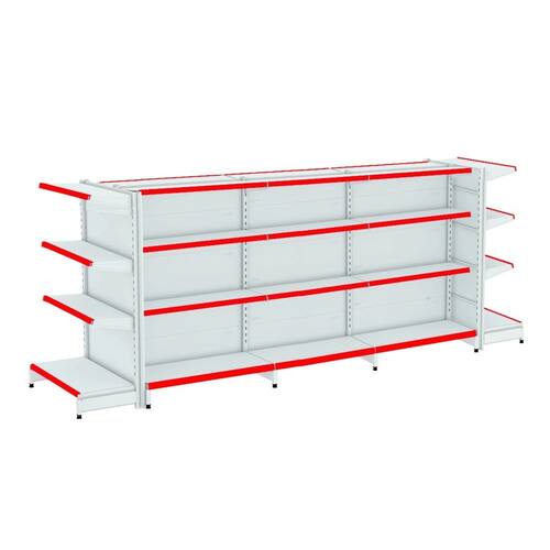 KIT GÔNDOLA CENTRO 137 FIT AMAPÁ 40/30 BRANCO PARA VÃO DE ATÉ 3,80 METROS COM DUAS PONTAS 32 BANDEJAS PORTA ETIQUETA VERMELHO