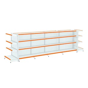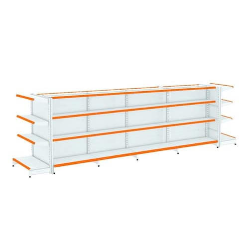 KIT GÔNDOLA CENTRO 137 FIT AMAPÁ 40/30 BRANCO PARA VÃO DE ATÉ 4,70 METROS COM DUAS PONTAS 40 BANDEJAS PORTA ETIQUETA LARANJA