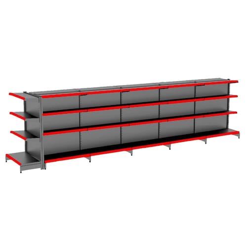 KIT GÔNDOLA CENTRO 137 FIT AMAPÁ 40/30 PRETO PARA VÃO DE ATÉ 5,30 METROS COM UMA PONTA 44 BANDEJAS PORTA ETIQUETA VERMELHO
