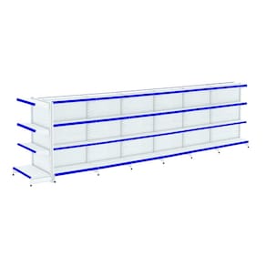 KIT GÔNDOLA CENTRO 137 FIT AMAPÁ 40/30 BRANCO PARA VÃO DE ATÉ 6,30 METROS COM UMA PONTA 52 BANDEJAS PORTA ETIQUETA AZUL