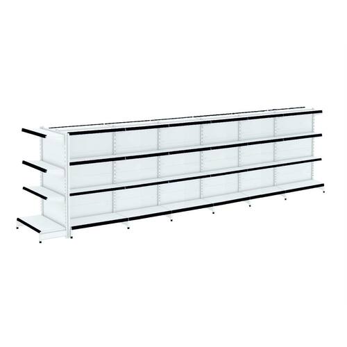 KIT GÔNDOLA CENTRO 137 FIT AMAPÁ 40/30 BRANCO PARA VÃO DE ATÉ 6,30 METROS COM UMA PONTA 52 BANDEJAS PORTA ETIQUETA PRETO