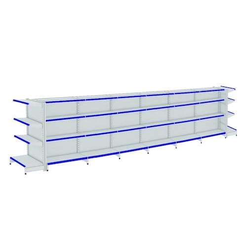 KIT GÔNDOLA CENTRO 137 FIT AMAPÁ 40/30 BRANCO PARA VÃO DE ATÉ 6,70 METROS COM DUAS PONTAS 56 BANDEJAS PORTA ETIQUETA AZUL