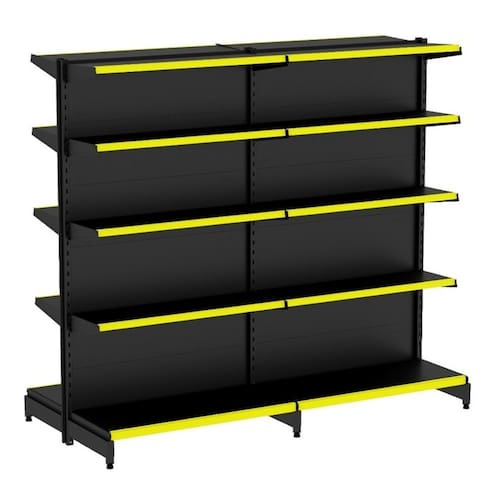 KIT GÔNDOLA CENTRO 170 FIT AMAPÁ 40/30 PRETO PARA VÃO DE ATÉ 2 METROS 20 BANDEJAS PORTA ETIQUETA AMARELO