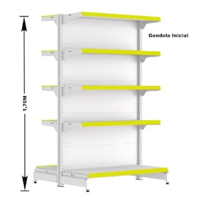 KIT GÔNDOLA CENTRO 170 FIT AMAPÁ 40/30 BRANCO PARA VÃO DE ATÉ 4,50 METROS COM UMA PONTA 45 BANDEJAS PORTA ETIQUETA AMARELO