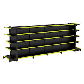 KIT GÔNDOLA CENTRO 170 FIT AMAPÁ 40/30 PRETO PARA VÃO DE ATÉ 4,70 METROS COM DUAS PONTAS 50 BANDEJAS PORTA ETIQUETA AMARELO