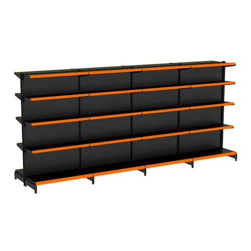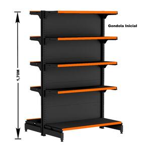 KIT GÔNDOLA CENTRO 170 FIT AMAPÁ 40/30 PRETO PARA VÃO DE ATÉ 3,9 METROS 40 BANDEJAS PORTA ETIQUETA LARANJA