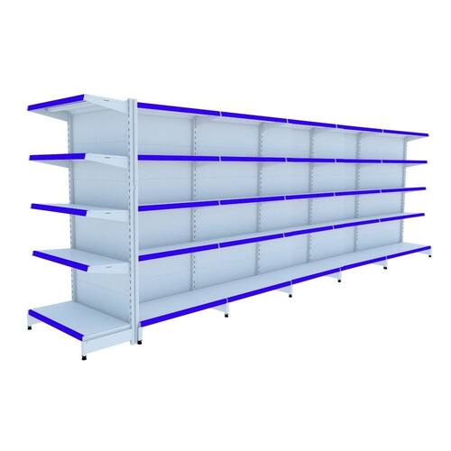 KIT GÔNDOLA CENTRO 170 FIT AMAPÁ 40/30 BRANCO PARA VÃO DE ATÉ 5,3 METROS COM UMA PONTA 55 BANDEJAS PORTA ETIQUETA AZUL