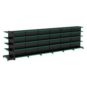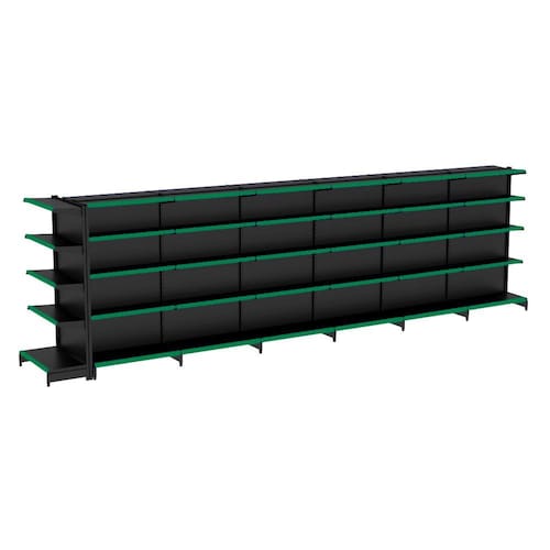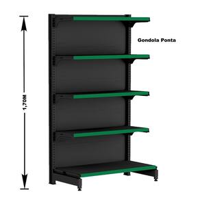 KIT GÔNDOLA CENTRO 170 FIT AMAPÁ 40/30 PRETO PARA VÃO DE ATÉ 6,3 METROS COM UMA PONTA 65 BANDEJAS PORTA ETIQUETA VERDE