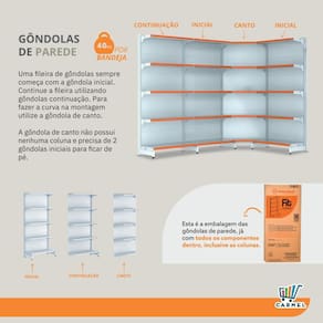 Facilmente instalada na parede devido ao sistema de montagem por encaixe, sem uso de parafusos, com inclinação da bandeja em 3 posições e fundo quadrado para melhor exposição, possui bandejas reguláveis na coluna a cada 25mm, o que permite adição de bandejas extras.