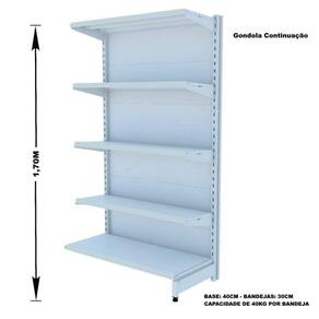 A Gôndola Premium Flex 40 Parede é ideal para supermercados, mercearias, lojas de utilidades, materiais de construção, agropecuárias e outros. Prática e fácil de montar, com sistema de encaixe sem utilização de parafusos, possui bandejas reguláveis a cada 4,5cm, pés com regulagem de altura, colunas dupladas e tratamento especial da superfície.