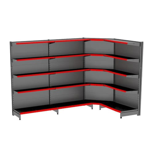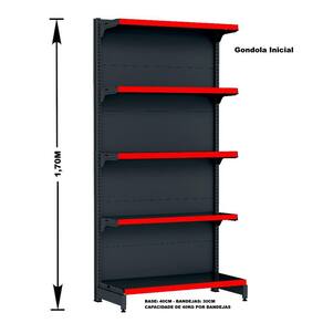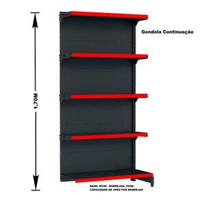 GONDOLA PAREDE 170 FIT AMAPÁ PARA VÃO DE ATÉ 3 METROS MAIS UM CANTO 40/30 PRETO 20 BANDEJAS PORTA ETIQUETA VERMELHO