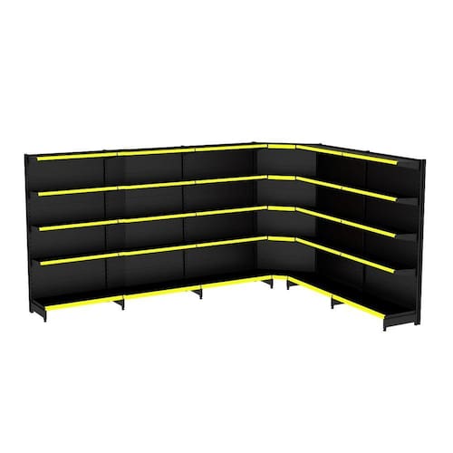 GONDOLA PAREDE 170 FIT AMAPÁ PARA VÃO DE ATÉ 5 METROS MAIS UM CANTO 40/30 PRETO 30 BANDEJAS PORTA ETIQUETA AMARELO