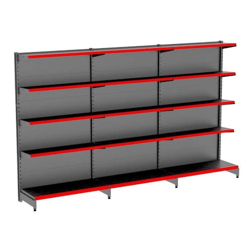 GONDOLA PAREDE 196 AMAPÁ FLEX 60 EXTRA-FORTE KIT 3 METROS 5 BANDEJAS 1X40 CM +4X 35 CM PRETO PORTA ETIQUETA (FAIXA) VERMELHO