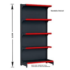 GÔNDOLA PAREDE 202 FIT AMAPÁ PARA VÃO DE ATÉ 2 METROS 40/30 PRETO 10 BANDEJAS PORTA ETIQUETA VERMELHO