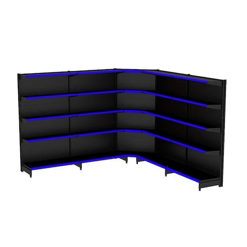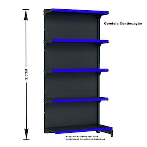 GONDOLA PAREDE 202 FIT AMAPÁ PARA VÃO DE ATÉ 4 METROS MAIS UM CANTO 40/30 PRETO 25 BANDEJAS PORTA ETIQUETA AZUL