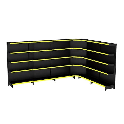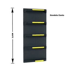 GONDOLA PAREDE 202 FIT AMAPÁ PARA VÃO DE ATÉ 5 METROS MAIS UM CANTO 40/30 PRETO 30 BANDEJAS PORTA ETIQUETA AMARELO