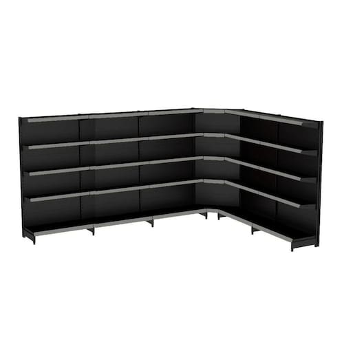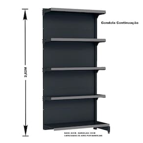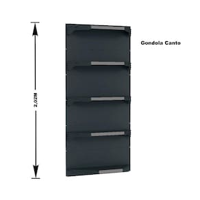 GONDOLA PAREDE 202 FIT AMAPÁ PARA VÃO DE ATÉ 5 METROS MAIS UM CANTO 40/30 PRETO 30 BANDEJAS PORTA ETIQUETA CINZA