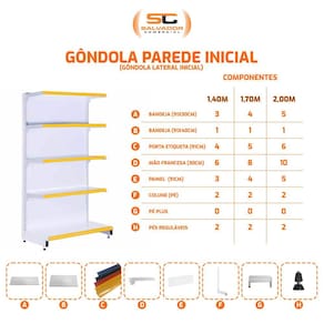 O módulo parede inicial inclui 5 bandejas de 91x30 cm, 1 bandeja de 91x40 cm, 6 porta etiquetas de 91 cm, 10 mãos francesas de 30 cm, 5 painéis de 91 cm, 2 colunas (pés) e 2 pés reguláveis.