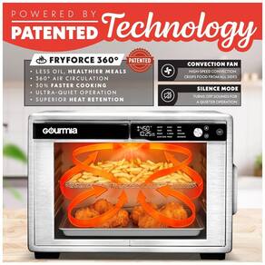 O Gourmia GTF3588S é um forno elétrico de bancada com portas francesas e capacidade aproximada de 35 litros (37 QT), projetado para funcionar como air fryer, forno de convecção e torradeira em um único equipamento. A cavidade comporta refeições familiares em assadeiras, pizzas de cerca de 33 cm e até 9 fatias de pão por ciclo. O sistema FryForce 360 utiliza circulação de ar quente com potência de 1700W, permitindo dourar e crocantar alimentos com pouco ou nenhum óleo.