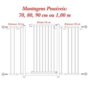 Multigrade - grade portão + 1 extensor 20 cm + 1 extensor 10 cm + kit fixação - multiformaCor: branco- montagens possíveis: 70 cm; 90 cm; 80 cm ou 1,00 m considerar regulagem de 2 cm para menos e 3 cm para mais controlado pelo conjunto de fixação - altura do portão: 77 cm- espaçamento entre varetas da grade: 5cm- distancia da travessa inferior: 5 cm- estrutura tubular fabricada em aço com aplicação de pintura epóxi, para aumentar a durabilidade- sua instalação dispensa o uso de ferramentas ou furos para fixação- o sistema de travamento por pressão impede sua abertura por crianças ou animais, separando os ambientes- quando acionado, permite abertura completa da grade para ambos os lados.- seu sistema de passagem mais amplo e travessa em altura reduzida, facilitam a passagem mesmo para pessoas com alguma dificuldade de locomoção.A multiforma produz multigrade para vão de 70 cm até 1,50 m que podem ser fixadas sem necessidade de furos e/ou ferramentas, nas cores branco, preto, prata, azul, rosa e cobre lançamento .Observação:- nunca utilize este produto ou qualquer outro similar como grade de proteção ou segurança em escada, janela ou similar.- sua função é exclusivamente como separador de ambientes.Composição do produto:- 1 grade portão de 68 cm- 1 extensor de 10 cm- 1 extensor de 20 cm- 4 conjunto de parafusos + manípulos + buchas para fixação